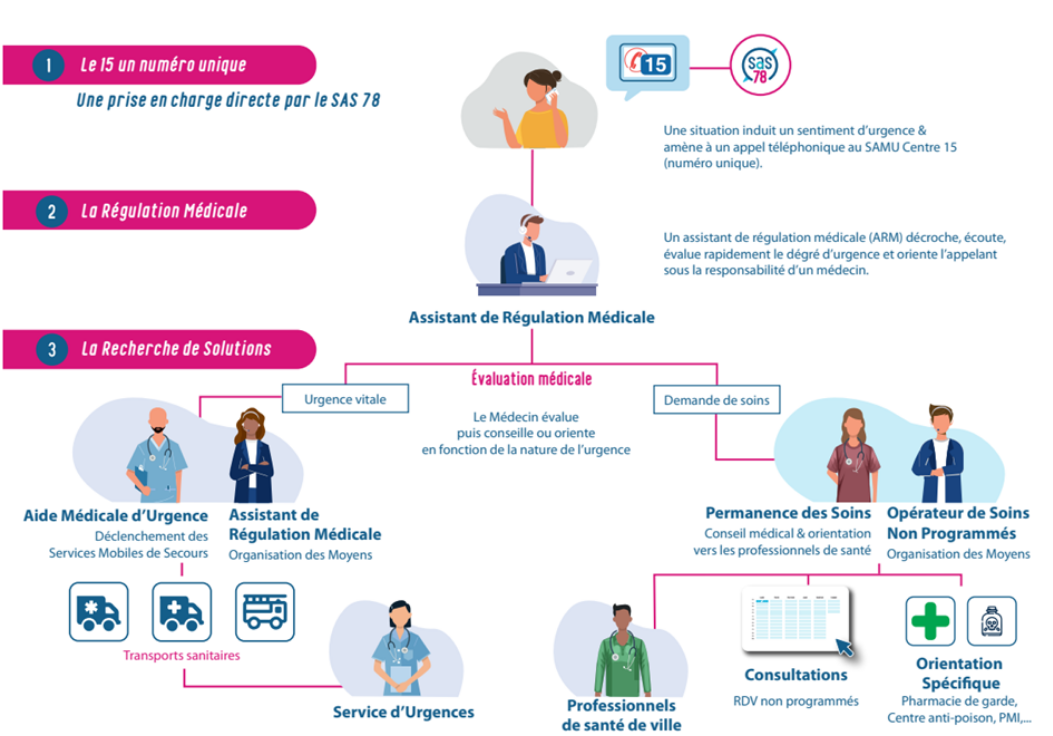 Opérationnel depuis janvier 2022, le SAS 78 est le fruit d’une coopération entre les professionnels de santé de Ville via l’APTA 78 et de l’Hôpital via le Centre Hospitalier de Versailles et le SAMU 78.